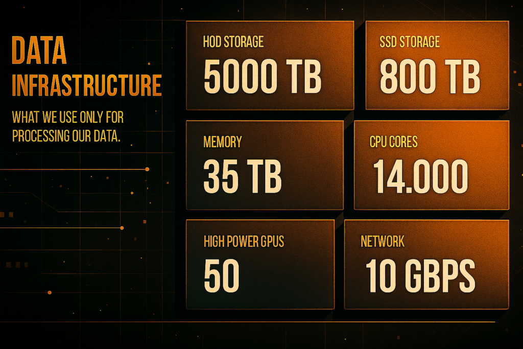 To give you a sense of the scale, we require over 4 petabytes (4,096 TB) of HDD storage and 800 TB of high-speed SSD storage. The brains of the operation consist of 14,000 CPU cores35 TB of RAM, and a cluster of 50 high-power GPUs to handle our machine learning pipelines. This is the raw power needed to make sense of the internet’s chaos.