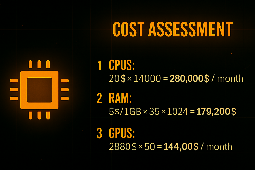 Next, we calculated the cost of the engine itself—the compute. The bill for CPUs, RAM, and GPUs totaled an additional $603,000 per month. This is the price tag for the raw intelligence of our system.